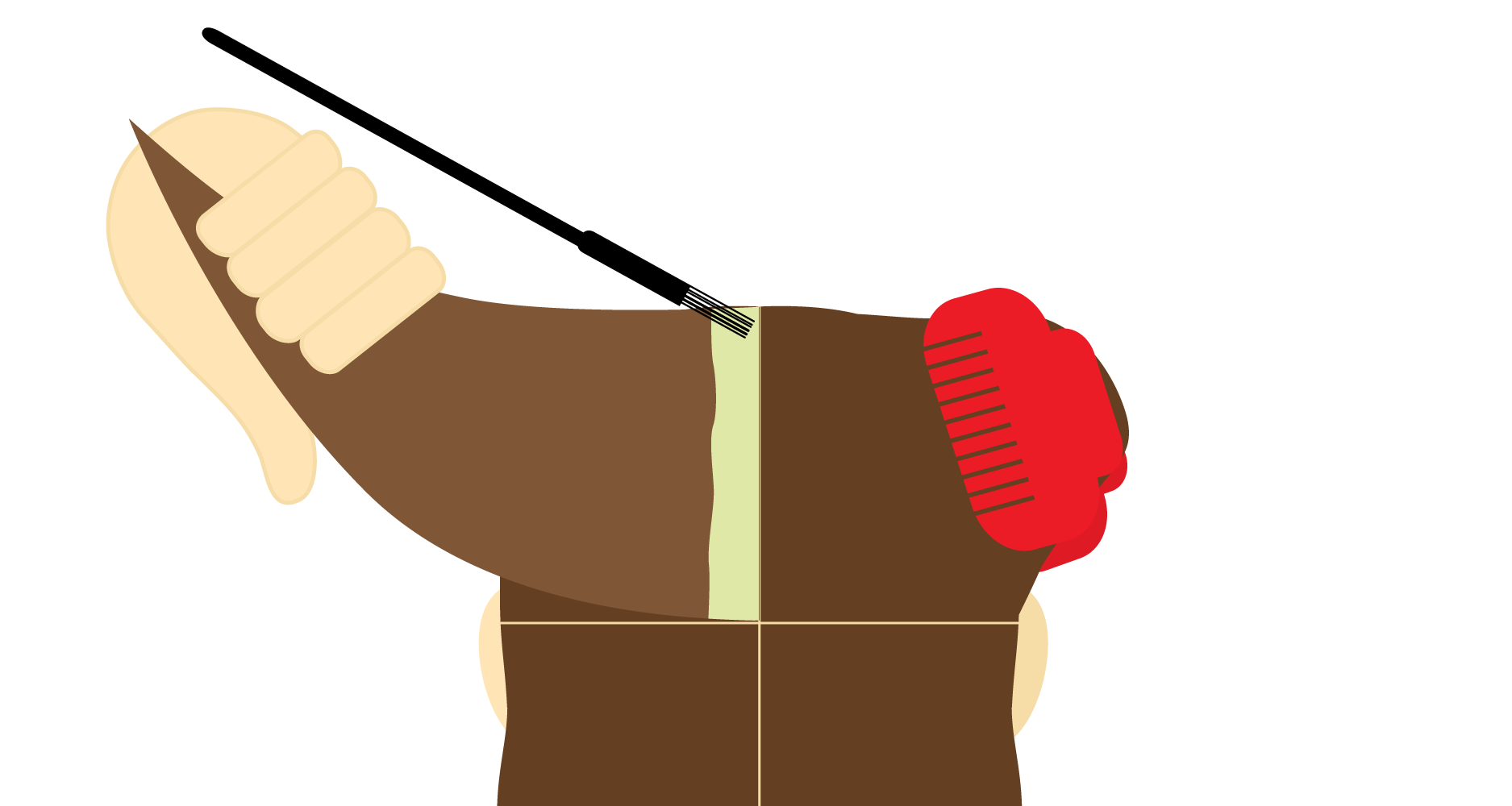 Beginning in either Top Section, guide the pointy end of your Tint Brush through the entire width of the Hair Section to create a row that is around 1-1.5cm thick, leaving the rest of your Hair section behind. Pull the Hair tight to define your working area.